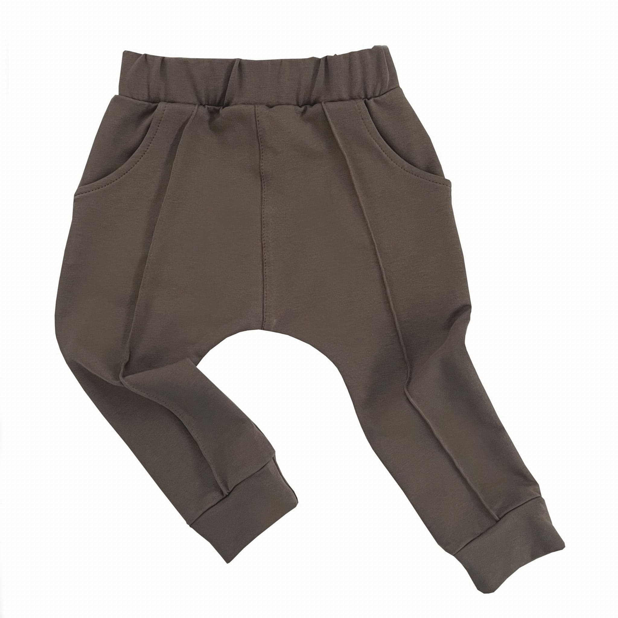 Spodnie dziecięce typu baggy wykonane z miękkiej w dotyku dzianiny dresowej. Posiadają obniżony krok i kieszenie z przodu, w pasie wszyta jest elastyczna guma. Ozdobne przeszycia z przodu dodają elegancji, a przy tym są bardzo wygodne. Z tyłu naszyta jest kieszonka.